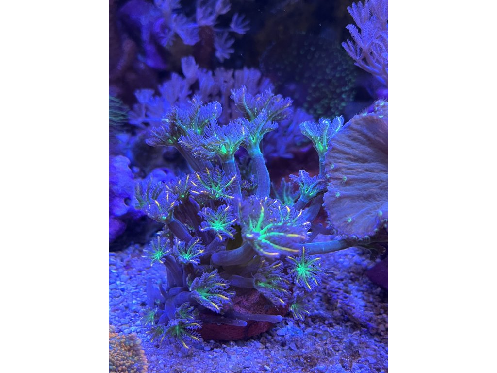 Clavularia viridis, známá pod názvy Green Star Polyps (GSP) nebo trubnatka, je naprostá klasika. Pokud chceš v akváriu vytvořit efekt "travnatého koberce", je to tvoje jasná volba.