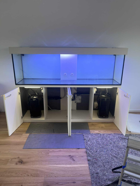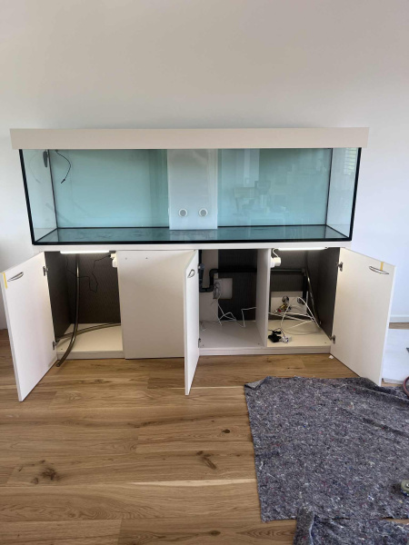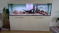 Akvárium: 200x50x60 cm (600 l) , 12mm sklo, lepené černým silikonem. Bílá přepadová šachta, bílá folie na zádech.