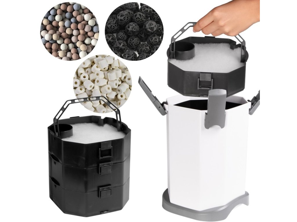V jeho srdci pracují tři samostatné koše na filtrační média – každý s jinou náplní, aby poskytovaly komplexní mechanickou, biologickou a chemickou filtraci. Silný, ale stále kompaktní. Výkonný, ale tichý a energeticky úsporný.